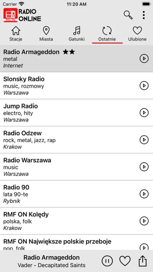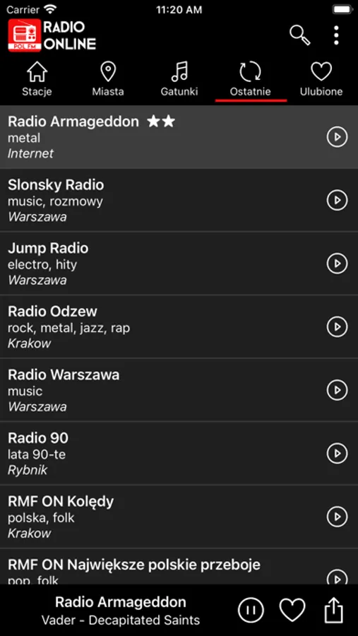 Opcja "Ostatnie" wyświetla ostatnich 50 słuchanych stacji radio FM, dzięki czemu zawsze możesz wrócić i zobaczyć, czego słuchałeś wcześniej.
