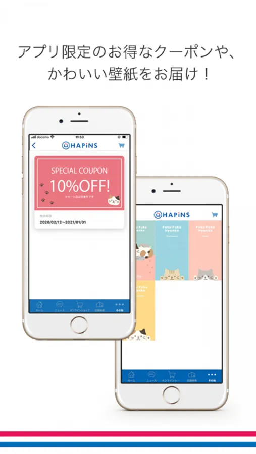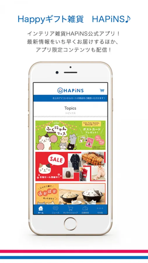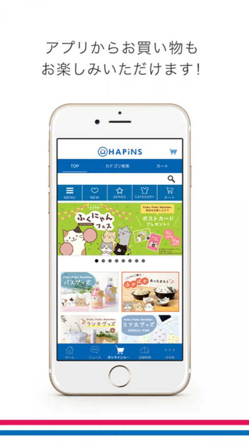インテリア雑貨店HAPiNSの公式アプリでは、新商品やお得なキャンペーン情報をいち早くお届けするほか、アプリからお買い物ができたり、アプリ限定のオリジナル壁紙やキャラクター紹介コンテンツなどもご覧いただけます!また、アプリ限定のクーポンも配信いたします!