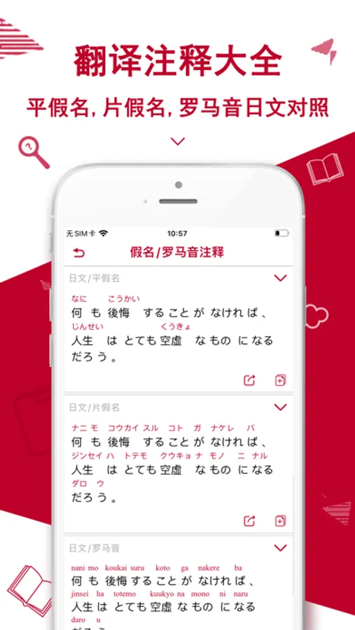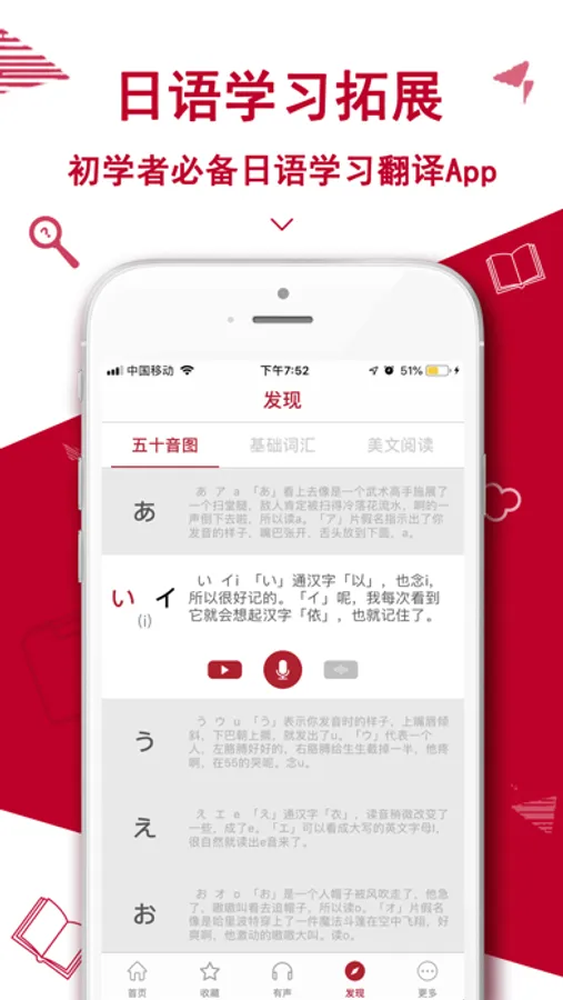 1,日语五十音图和发音表,平假名、平假名听读对比学习,清音、浊音/半浊音、拗音全部拼读表,支持离线学习。