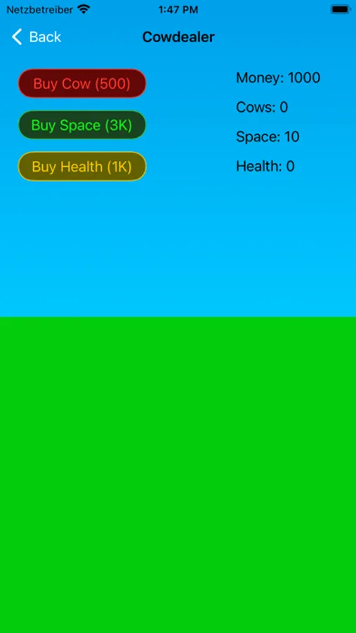 Start your career as a cowdealer. Buy cows, let them grow and sell them to a higher price. Enlarge your farm to get more space for your cows and make sure that your cows stay healthy so they live longer. But pay attention that you don't run out of money!
