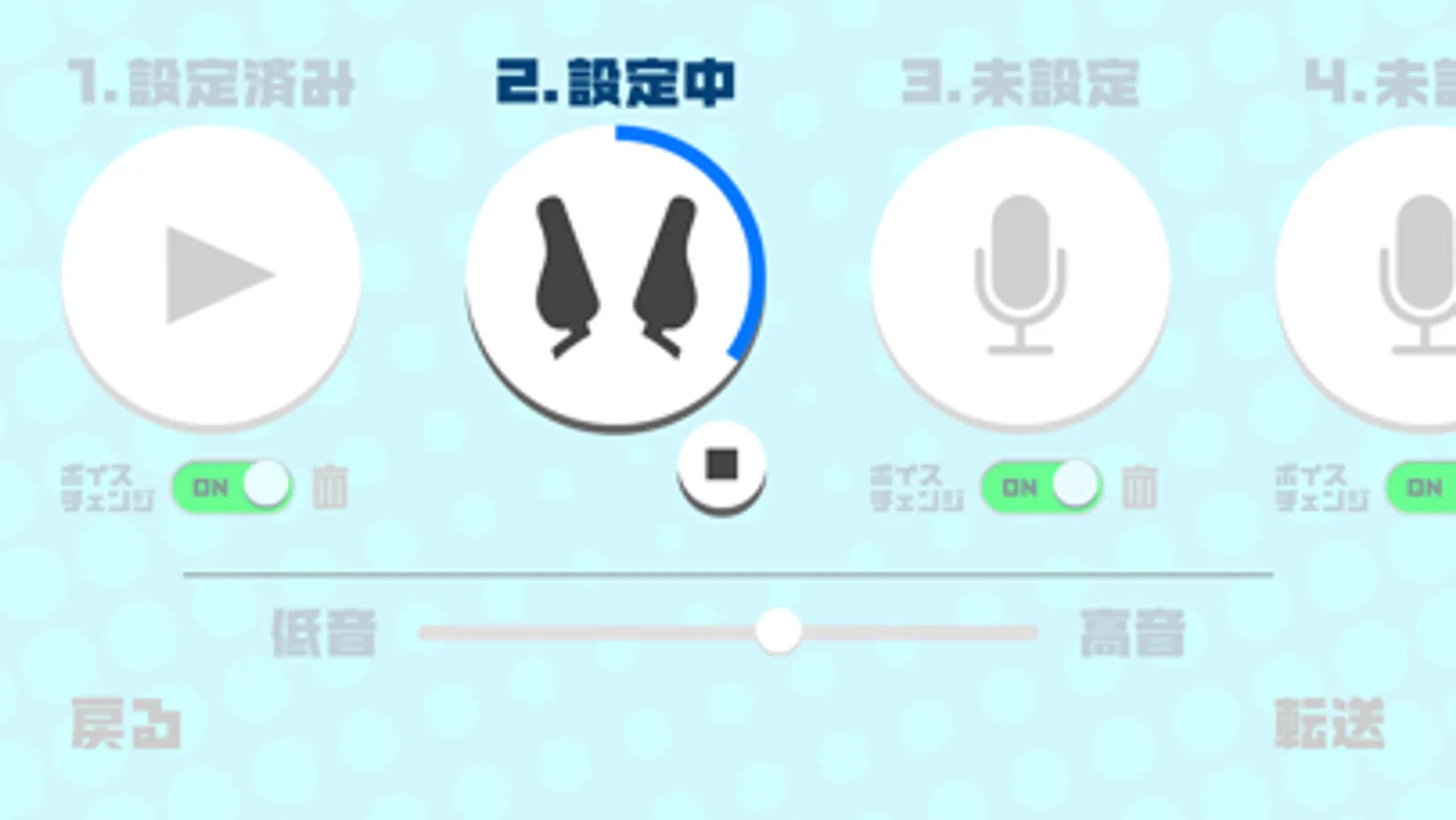 ビッグクラッピーの発話や拍手のパターンを作成し本体に転送するモードです。音声はビッグクラッピーの声でボイスチェンジすることもできます。転送後は本体背面のシチュエーション切替ボタンから「カスタム」に設定しご使用ください。
