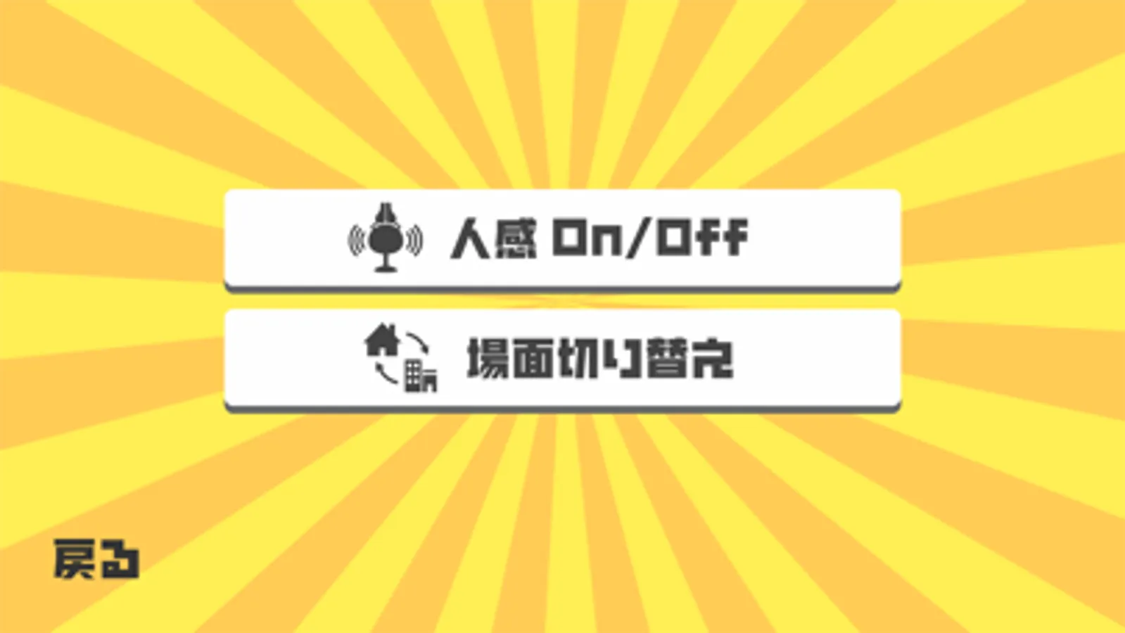 画面のボタンを押すことで、発話と拍手を手動で操作します。拍手ボタンを長押しと5秒間連続で拍手します。カスタム発話で作成した5つのセリフを再生操作することも可能です。(カスタム発話の操作はビッグクラッピー2020のみ対応)