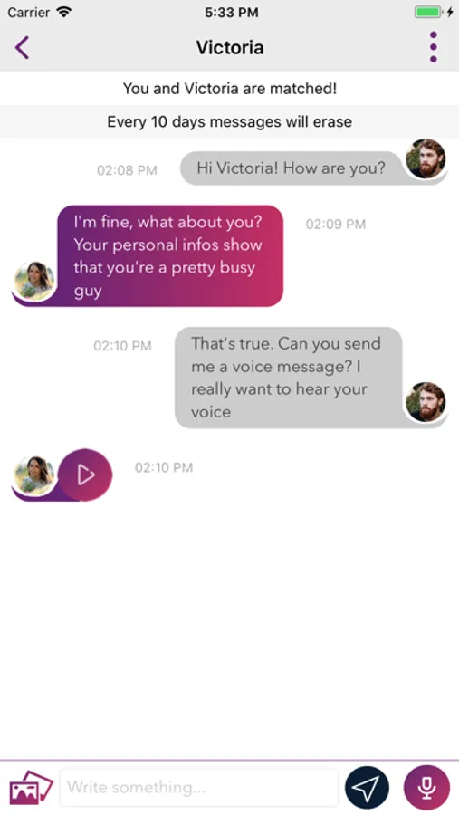 Speakou is a new dating mobile app, a network where you can browse free and safely profiles of new people. Check their profiles, swipe according to your preferences and chat with them via text and voice messages. Download Speakou now, for a new experience beyond the usual and boring text messages. You can now speak to the person that matches your preferences entering a fascinating new way of e-dating