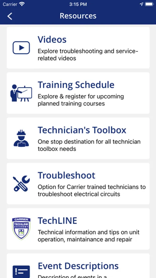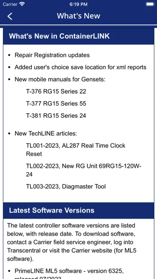 The Carrier Transicold ContainerLINK™ service app offers interactive resources for customers and service technicians, including: