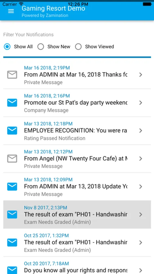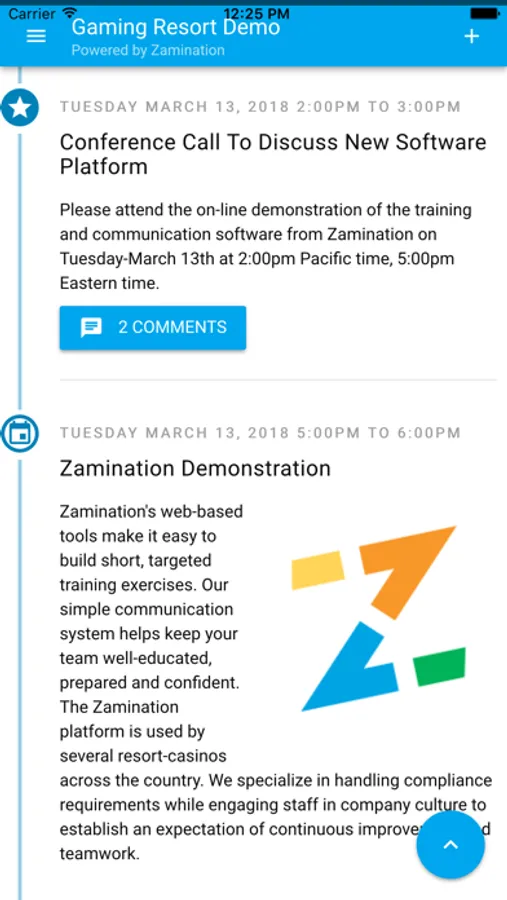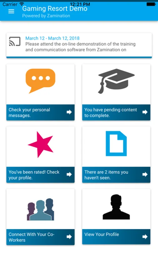 The Zam Mobile app gives you access to your Zamination profile, gives you tools to contact your co-workers, lets you view your Zamination notifications, and shows your company newsfeed.