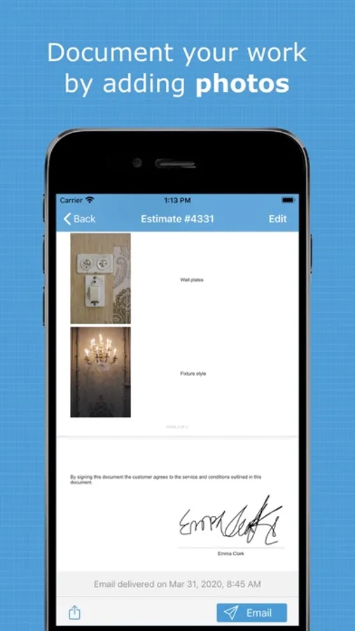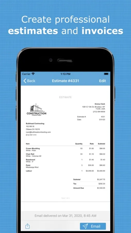 - Create professional, branded ESTIMATES and INVOICES with your own logo