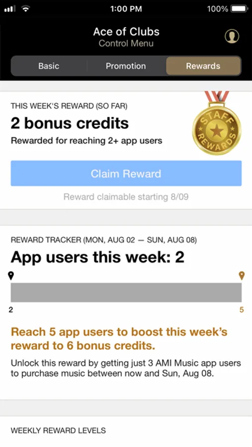 - Manage Staff Rewards – Track weekly progress for the Staff Rewards Program and redeem free AMI Music app credits earned.