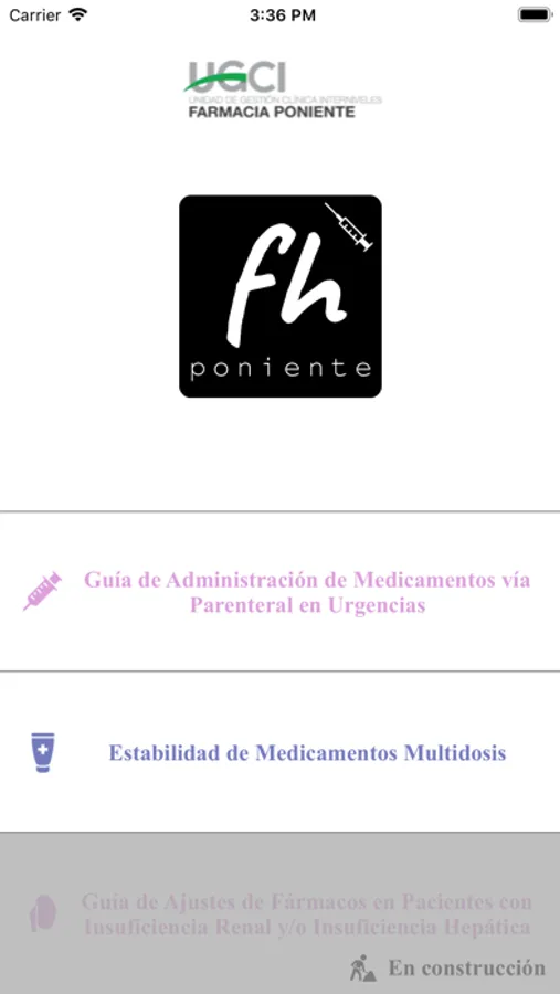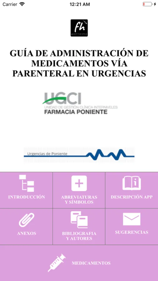 El primer recurso que se ha diseñado e incluido en la APP es la guía de ADMINISTRACIÓN de medicamentos vía PARENTERAL en el servicio de URGENCIAS (en el Hospital de Poniente).