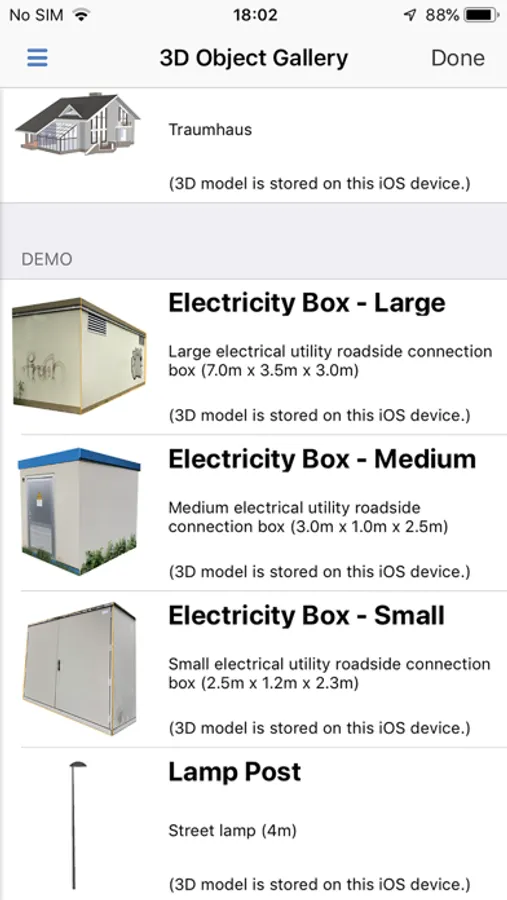 • Select from a fixed "Demo" Gallery of 3D Objects, placing and visualising these Objects in Augmented Reality