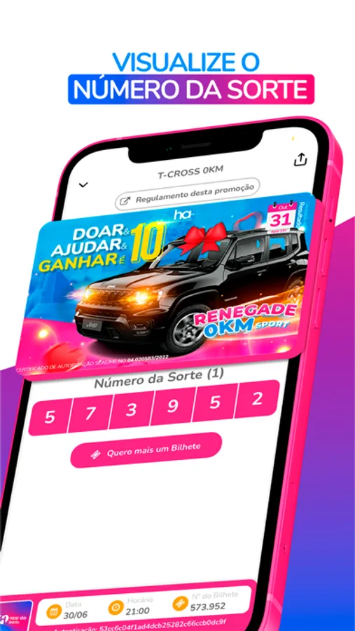 PROMOÇÃO AUTORIZADA PELA SECAP/ME SOB CERTIFICADO DE AUTORIZAÇÃO Nº 04.015157/2021. Você pode ajudar o Hospital de Câncer de Barretos comprando bilhetes eletrônicos do sorteio filantrópico “APÊ DO BEM” ou validando os cartões doação “APÊ DO BEM” ou validando os cartões doações “APÊ DO BEM” no app “APCAP DO BEM” a partir do dia 17/09/2021 - 12:00:00 até a as 17:59:59 do dia 29/12/2021. A realização deste Sorteio Filantrópico, pelo Hospital de Câncer de Barretos, o Hospital de Amor, está condicionada à autorização concedida pela SECAP/ME. O número do bilhete premiado será identificado pela correlação com os resultados das extrações da Loteria Federal nos dias especificados no regulamento autorizado. Na compra dos bilhetes, você estará ajudando o Hospital de Câncer de Barretos - Hospital de Amor inscrito no Nº CNPJ/MF: 49.150.352/000112.