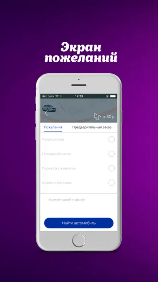 Перед поездкой возможно выбрать тарифный план (фиксированный/таксометр). Воспользуйтесь автоподбором или вручную выберите желаемую машину для поездки. Вы также можете указать необходимые опции — некурящий салон, курящий салон, перевозка животных, кондиционер.