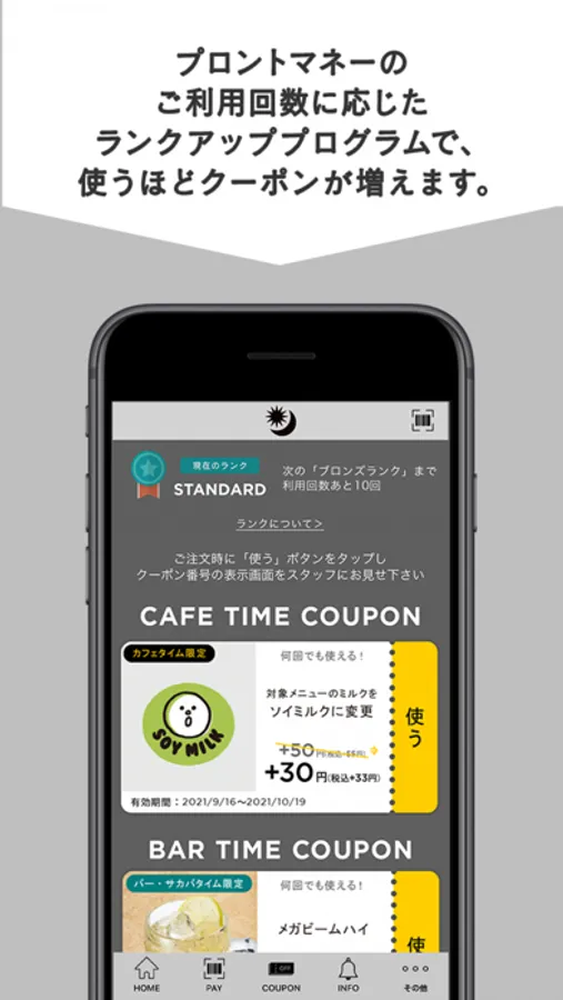新機能の「プロントマネー」は、チャージ金額に応じたボーナスマネープレゼントや、使うほどクーポンが増えるランクアッププログラムなど、プロントをよりスマートでお得にご利用いただける決済サービスです。