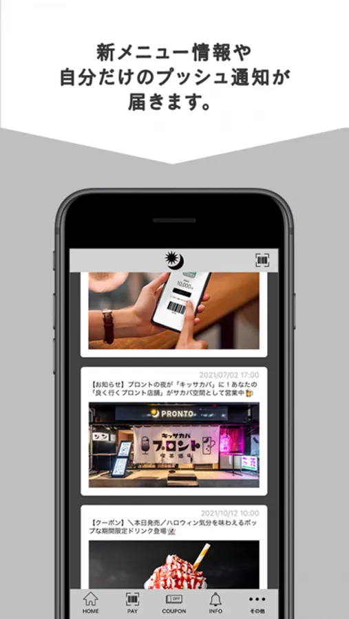 他にも、メニュー情報やクーポン等、「昼はカフェ、夜はサカバ。」という「二面性」をもつプロントから、様々な情報をお届けいたします。