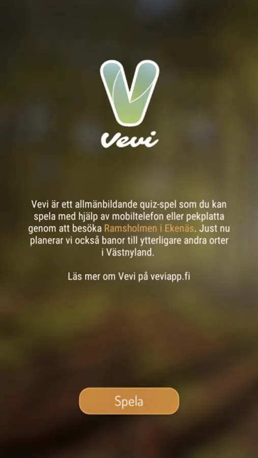 Vevi kombinerar aktivitet, kultur och teknologi till en upplevelse. Spelet är allmänbildande och för spelaren ut i naturen. Spelet riktas till alla åldrar men är speciellt anpassat för unga och skolelever. Fler quiz-kartor kommer installeras på andra områden i Västnyland.