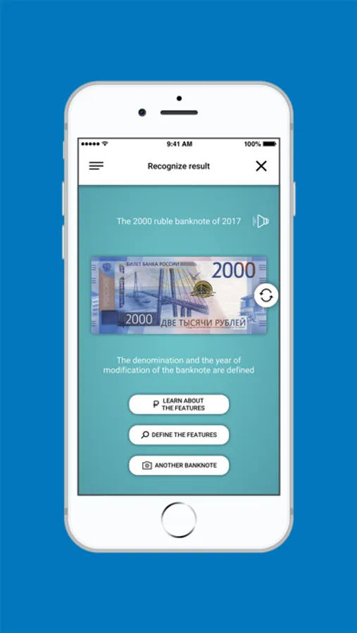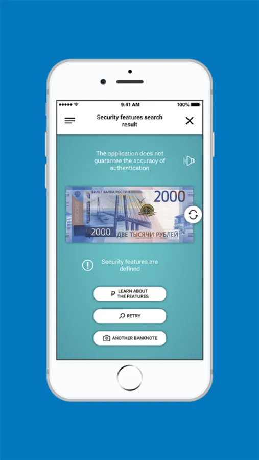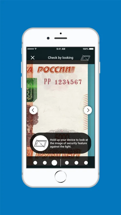 Now the application can locate security features on 1,000-ruble and 5,000-ruble notes modified in 2010, and 2,000-ruble notes. Please note that the application does not verify the authenticity of a banknote. What it does is help you to do it yourself - without any special equipment, simply by following the tips on your screen. This feature supports all banknotes. Security features can be checked in transmitted light, with a magnifying glass, by feeling or by tilting a note – and our app enables users to learn about each type of security features.