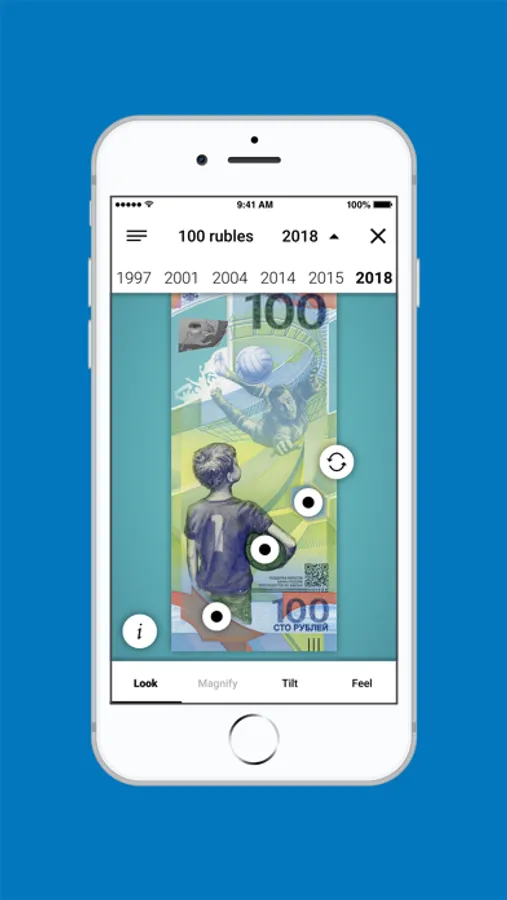 The app features all Bank of Russia notes and gives details of their security features. Click the ‘Listen’ button for audio descriptions in Russian and English.