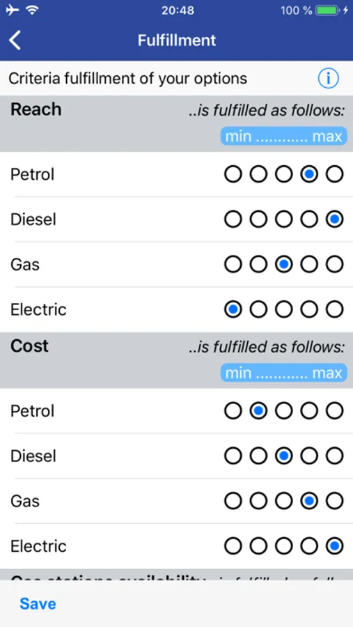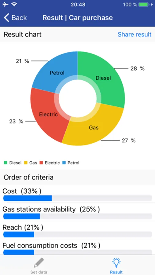 As a result, you will receive a recommendation for the best possible decision. WhatsDo evaluate and compares different options in the best possible way. The ranking of the options is shown in the form of a diagram. In addition, it is shown how important the individual criteria are for you in comparison to each other.