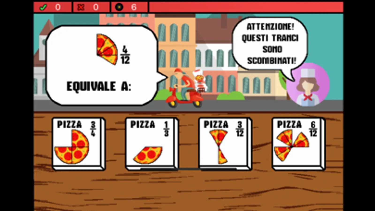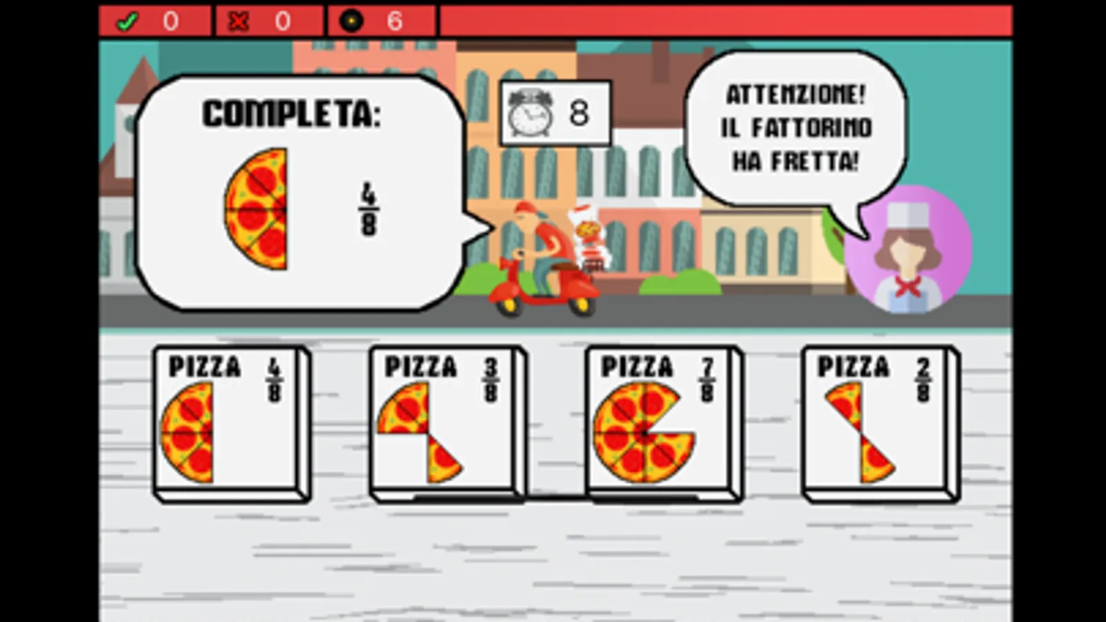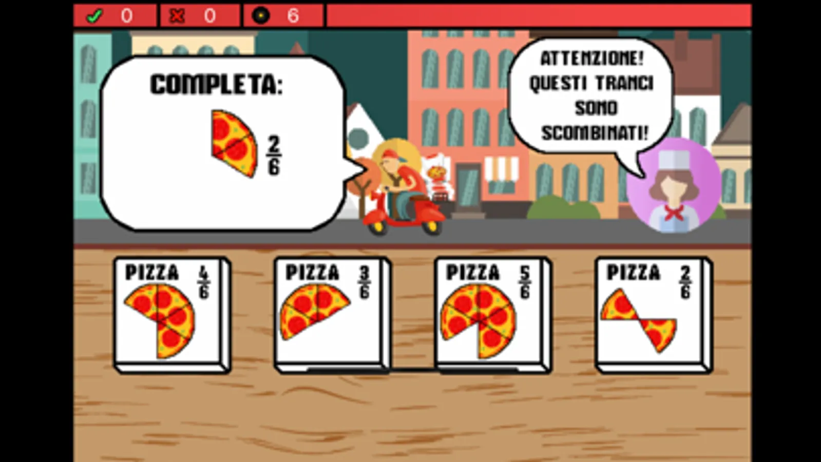 Abbiamo cuochi molto preparati che preparano le pizze, ma il fattorino è molto affamato, e se ne mangia delle porzioni durante il tragitto. Aiutalo a ricomporre la pizza intera, lanciando la frazione corretta.