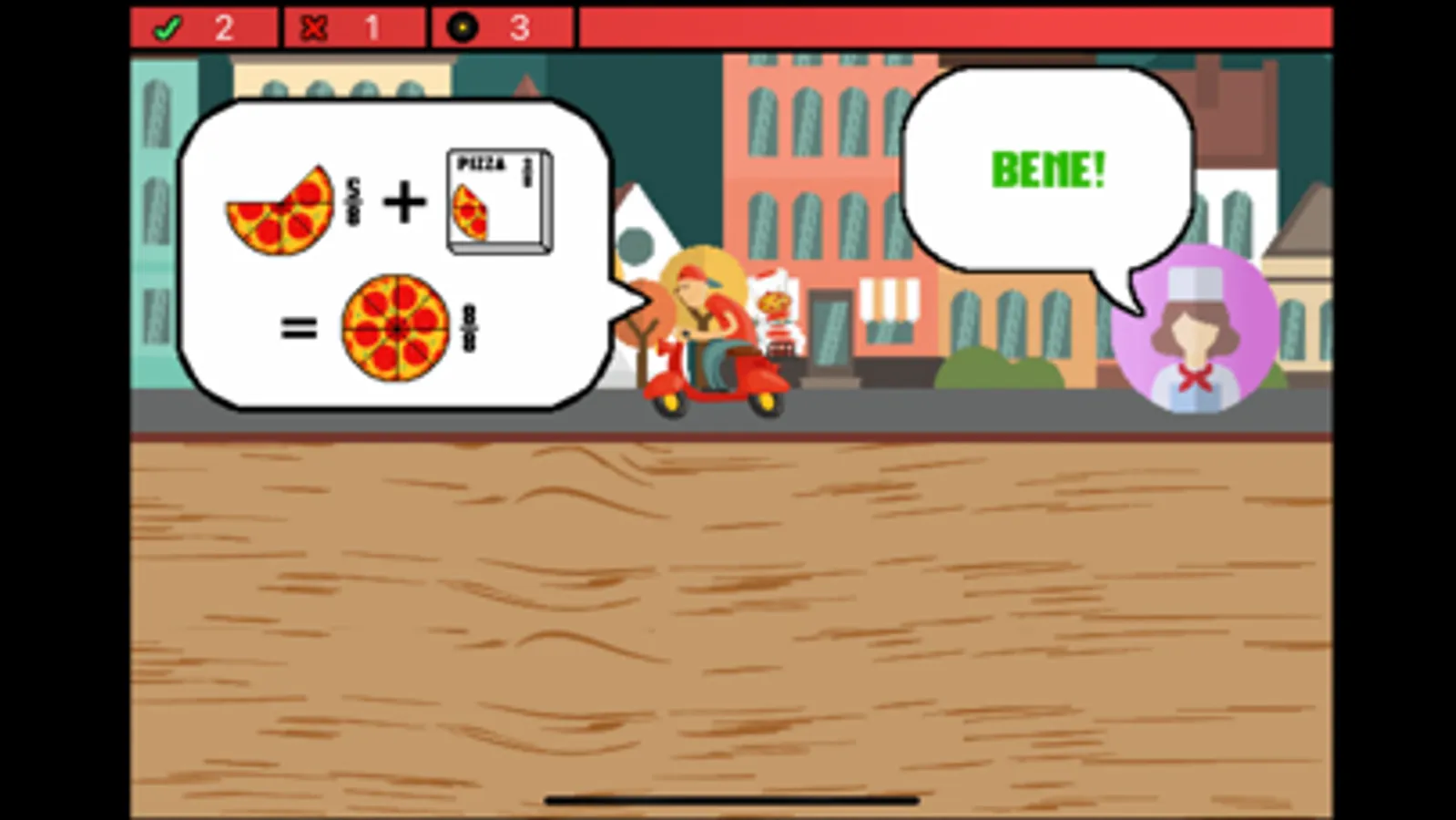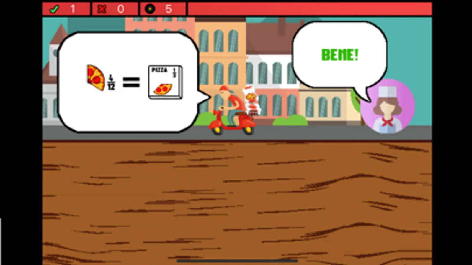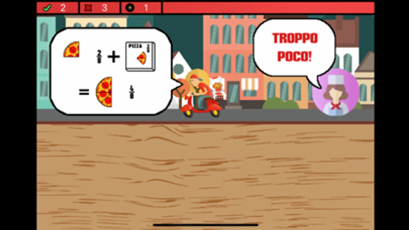 Abbiamo cuochi molto preparati che preparano le pizze, ma il fattorino è molto affamato, e se ne mangia delle porzioni durante il tragitto. Aiutalo a ricomporre la pizza intera, lanciando la frazione corretta.