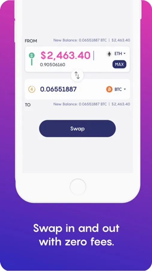 Swap between supported cryptocurrencies and tokens, instantly, easily, and with zero fees. You can use Swap to quickly react to the market, rebalance your portfolio, take profits, and get exposure to new coins.