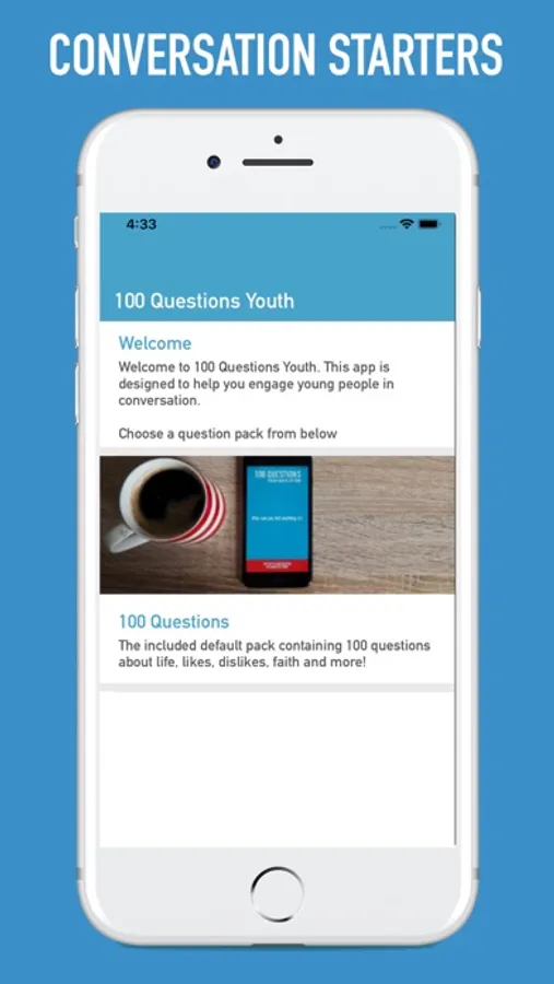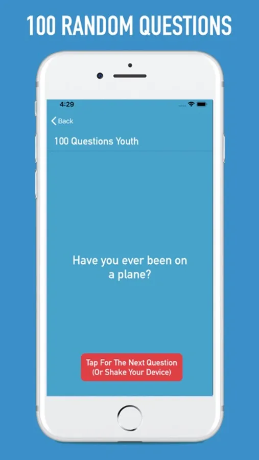 The 100 Questions app displays a random question when you shake your device or press the button. Aimed for use with 11-14 year olds.