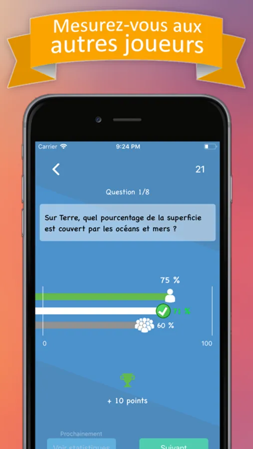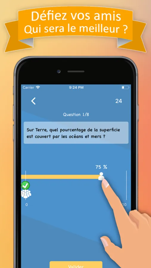 SlideQuiz est un jeu de quiz addictif ! Estimez la bonne réponse pour gagner contre la moyenne des joueurs !