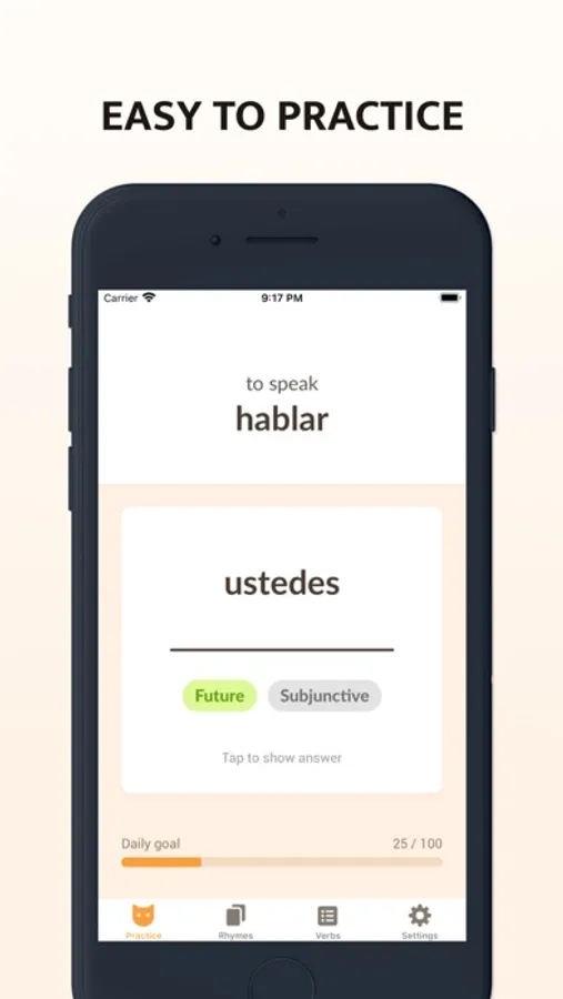 With ConjuGato, you don't need to type the answers – just think or say the correct verb and tap to check for yourself (you can enable the typing option in settings, if you wish). This is the perfect app for training your conjugation skills on the go, whenever you have a free minute.