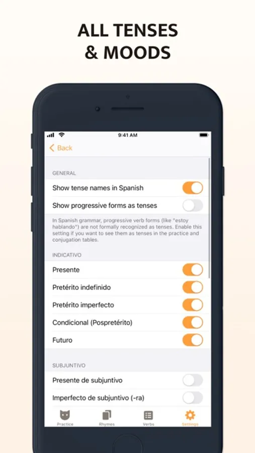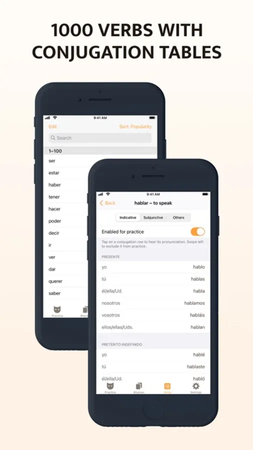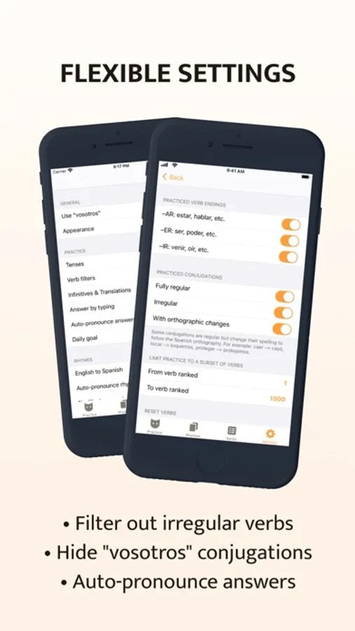 • Flexible settings: practice verbs based on irregularity, endings or popularity
