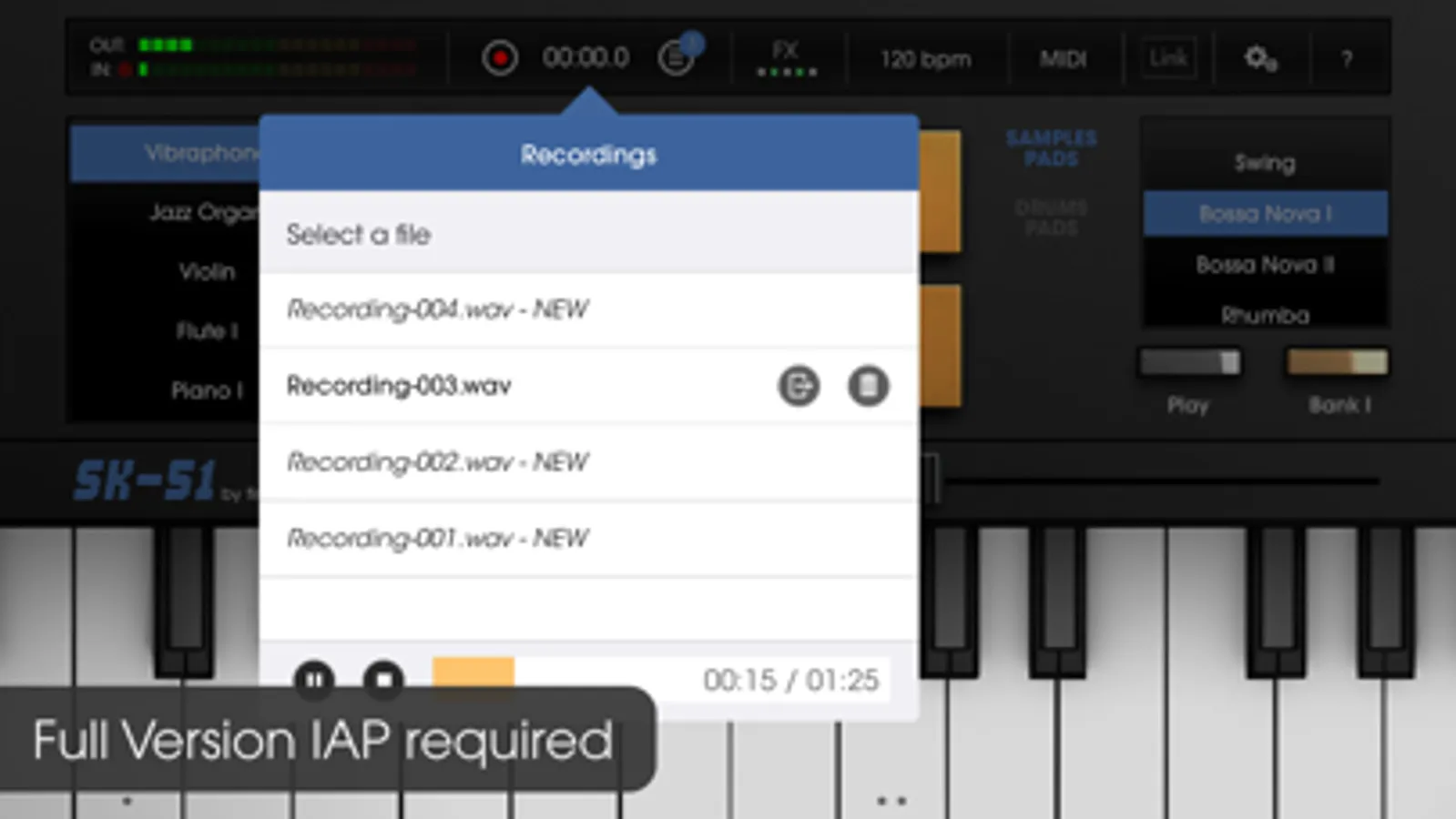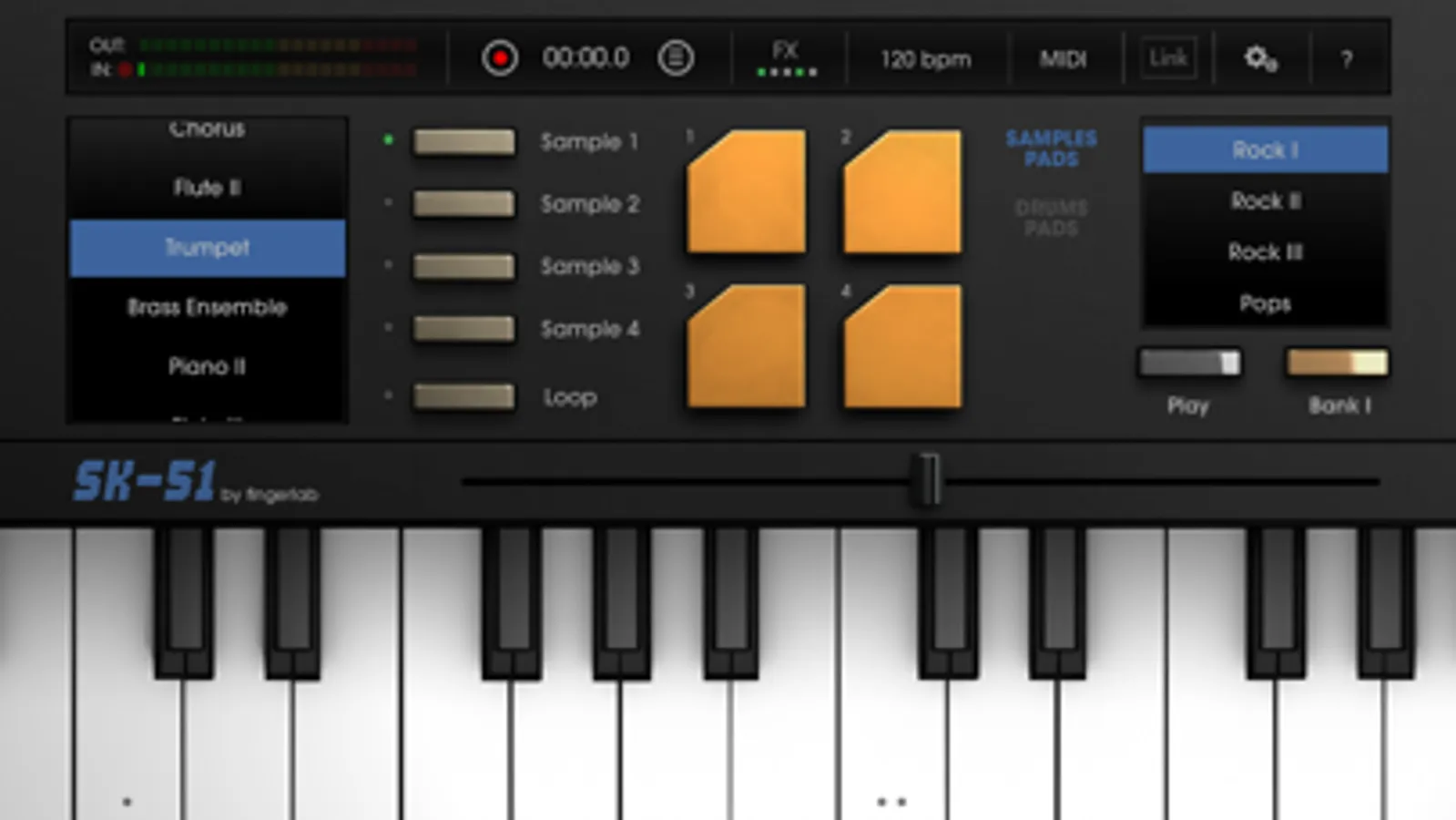 With its nice and true to life interface, many instruments (Trumpet, Flute, Piano, Vibraphone, …), 4 sampling slot and many drums patterns and sounds, the SK-51 is versatile and fun music tools.