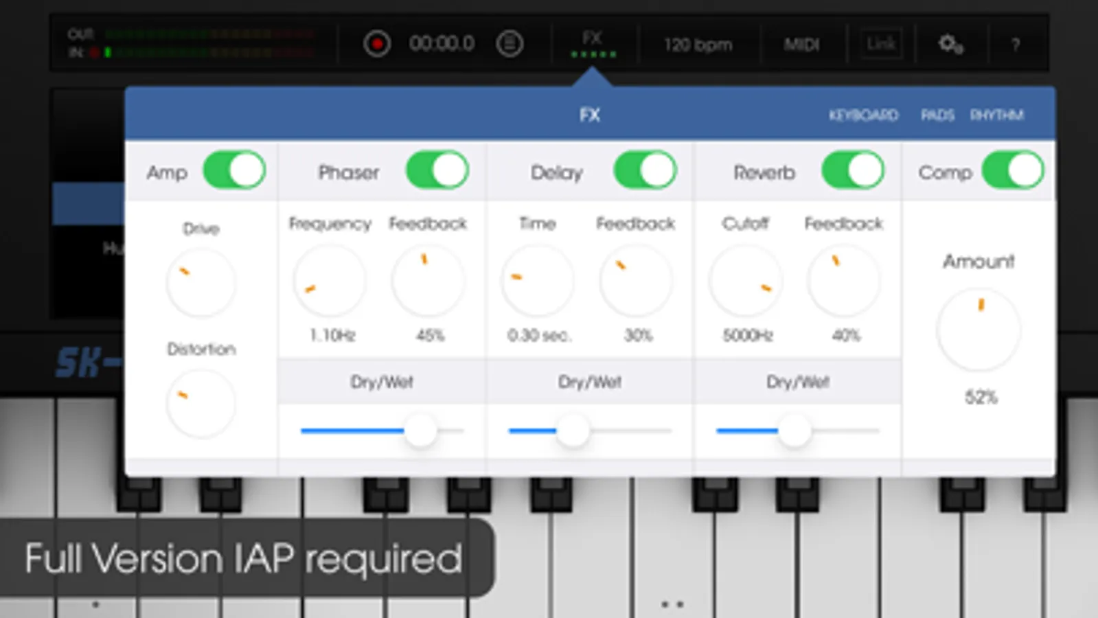 - 5 FX: TubeAmp, Phaser, Delay, Reverb & Compressor