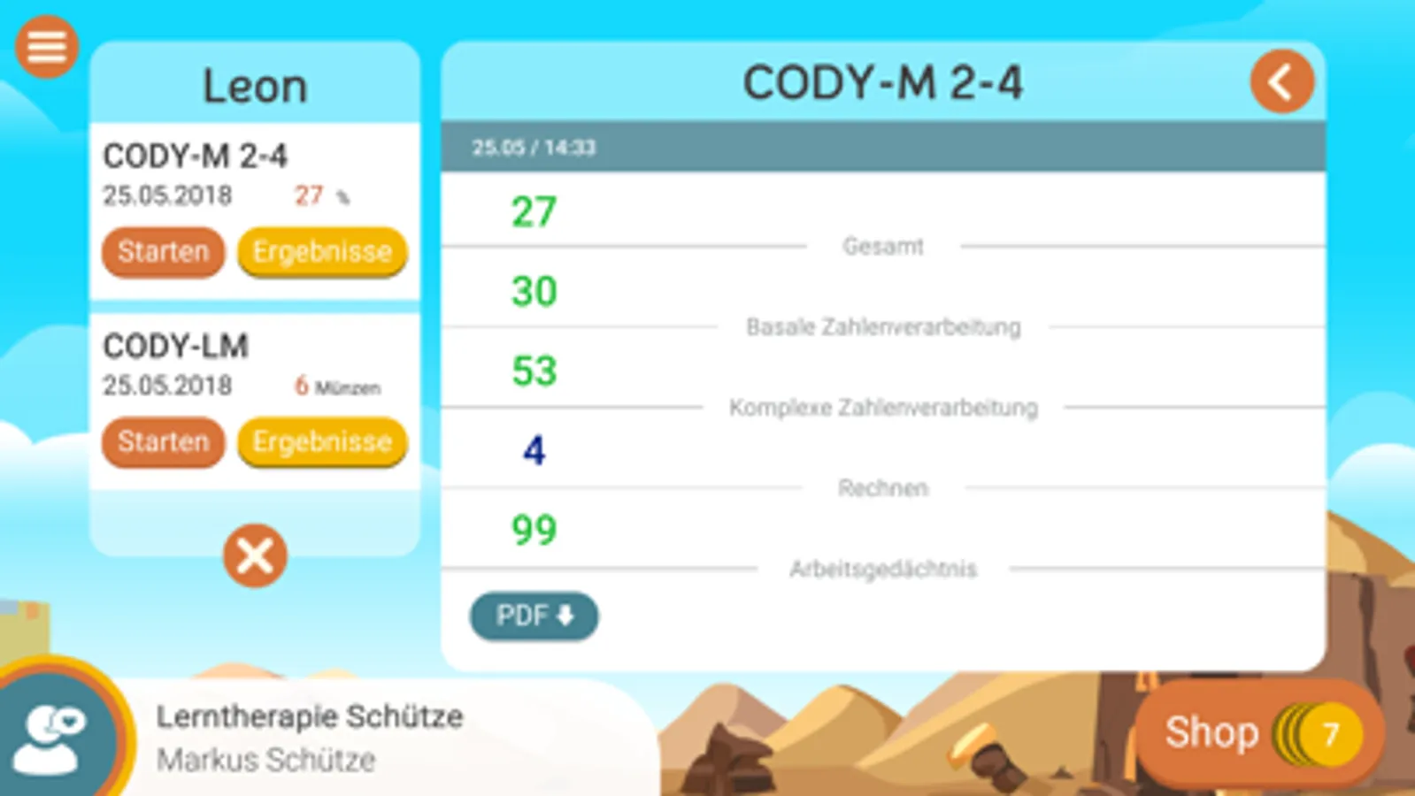 Die Auswertung des CODY-M 2-4 erfolgt zeitsparend automatisiert innerhalb des Programms in Form von individuellen Testprofilen (Gesamtwert und vier Subskalen: basale Zahlenverarbeitung, komplexe Zahlenverarbeitung, Rechnen, Arbeitsgedächtnis), die als Grundlage für die Förderplanung genutzt werden können. Für Eltern und als Testbeleg wird ein ausführlicher Bericht in PDF-Form generiert, der aus der App heraus heruntergeladen werden kann.