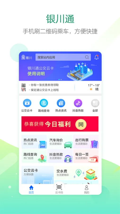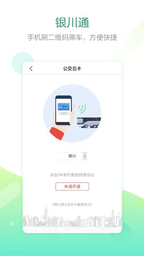 银川通是中电信用携手银川市公交总公司在“智慧公交”理念基础上,合力打造的便民APP。为银川市民提供云卡充值、二维码乘车;公交路线查询;便民缴费等服务。倡导市民开启高效、低碳、环保出行的移动支付绿色时代。