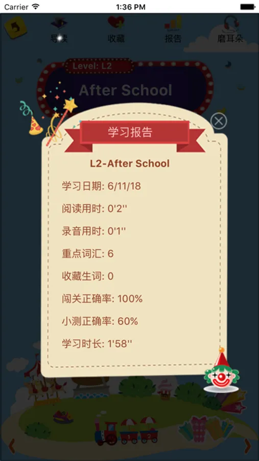 4、完成每篇书籍各个环节以后,都可以查看学习结果报告,内容包括学习日期、用时、闯关正确率、小测正确率、收藏生词等内容;