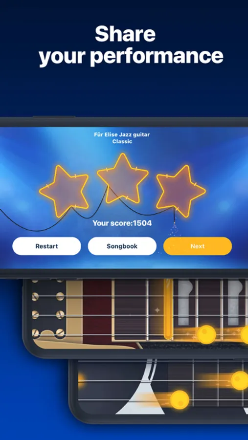 SHARING: music is for sharing. Play your guitar riffs, have fun and share positive vibes! Challenge your friend with your highest score and prove you are a top guitarist!