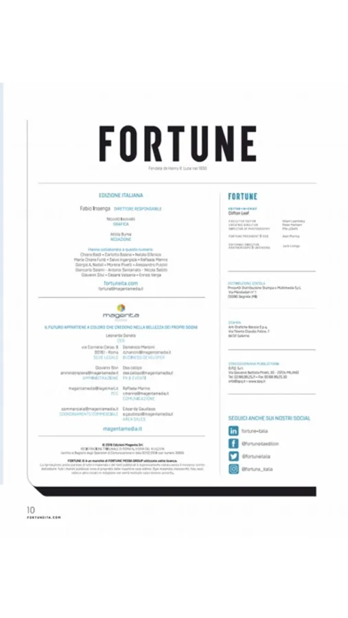 Fortune è riconosciuta da top-manager e opinion leader come una delle più autorevoli riviste al mondo. Fondata nel 1930 – quattro mesi dopo il “Crollo di Wall Street” – da Henry Luce, già cofondatore di TIME, ha da sempre l’obiettivo di accompagnare le aziende in una crescita costante, connettendole con business people di difficile accesso, offrendo la possibilità di un benchmark continuo con storie di successo, con imprese best-in-class, leadership forti e insight riservati. Oggi è un marchio di punta del gruppo Meredith. Indipendente. Influente. Internazionale.