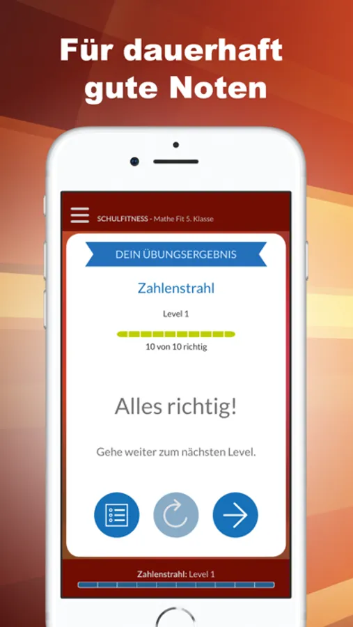 • Immer besser werden: Wenn du Bescheid weißt, geht es ab ins nächste von drei Levels – falsche Aufgaben werden wiederholt, bis du fit bist.