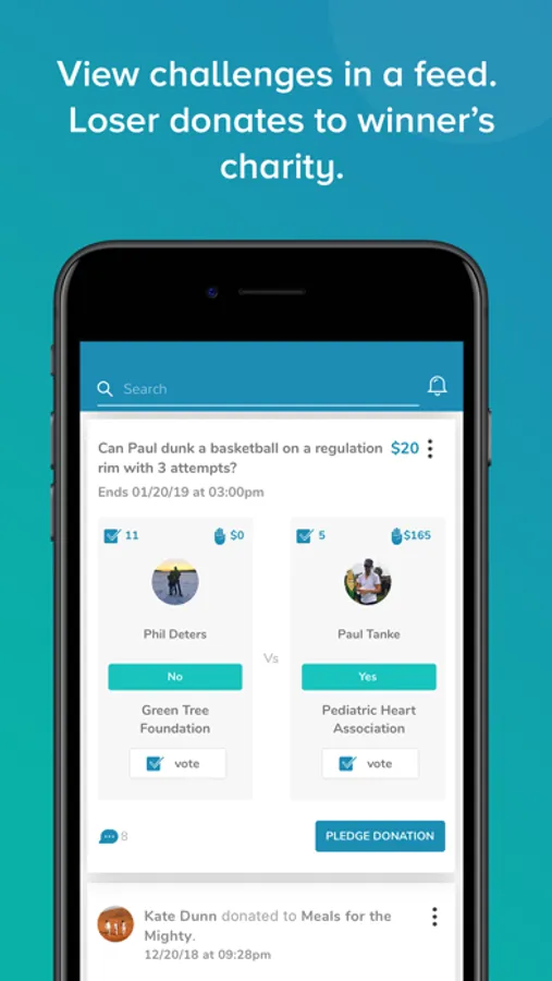 Donating should be fun. Challenge your friends in a “bet” format. If the challenge is accepted, others will see it in the feed where they can comment, vote on a winner, or even pledge a donation to the winner’s nonprofit. When the challenge is over and your victory is declared, enjoy the satisfaction of watching your opponent donate to your charity.