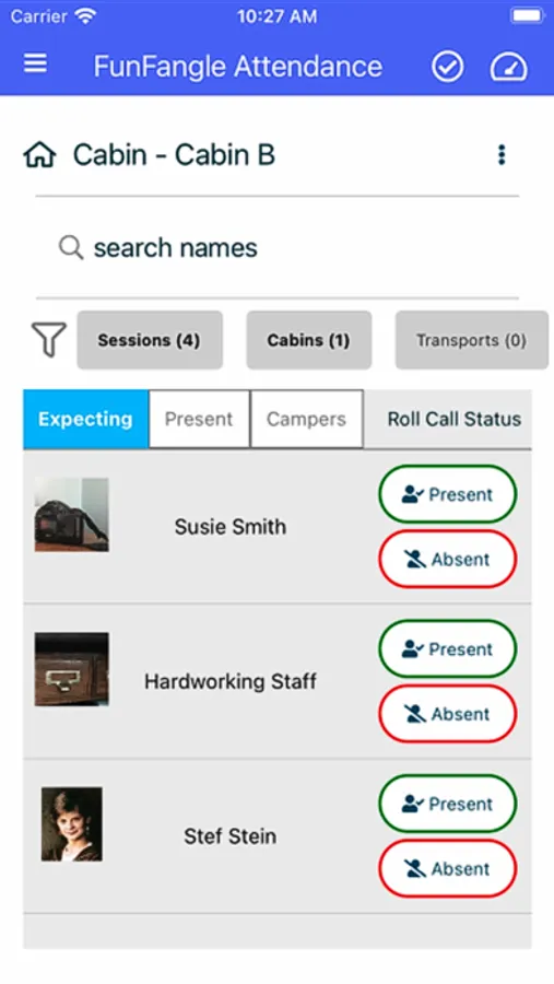 Attendance app for summer camps, day camps, schools, pools, gyms, and recreational activities. For camps and schools, it provides roll call for transportation, arrival, and meeting places (such as cabins), and for tracking departure.  For pools, gyms, etc., provides reservation creation and checkin, and entry control for members.