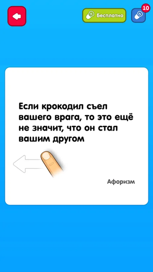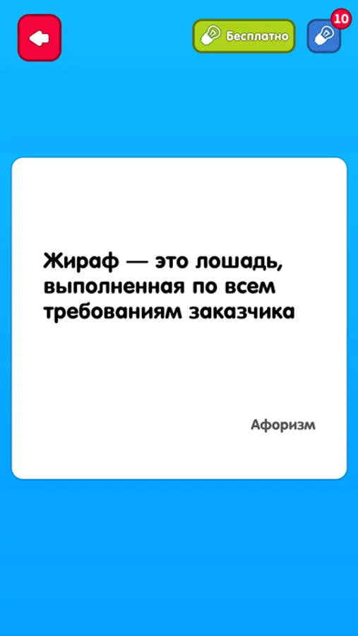 Слишком просто? Скачайте нашу игру и попробуйте пройти все загадки, составляя из букв правильные слова. Переставляйте буквы пальцем, чтобы получить ответ к каждому ребусу. После того, как вы отгадали слово, вас ждет приз — шутка, афоризм или умная цитата на данную тему. Обновите свой статус в социальных сетях, с помощью нашей игры.