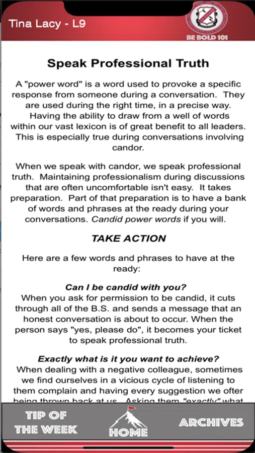 While components of this app (Servant Leadership, Tip of the Week and Archives) are available for anyone, it has been designed primarily for No Excuses Leadership Academy graduates. Academy grads will receive logins that grant access to masterclass content helping them to refine their work around the Nine Bold Choices among a community of leaders who are like-minded.