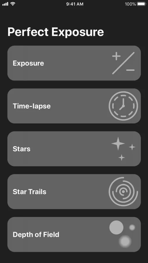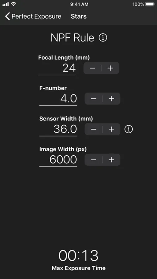 Perfect Exposure helps you calculate the exposure time when you change the aperture, ISO, or ND filters.