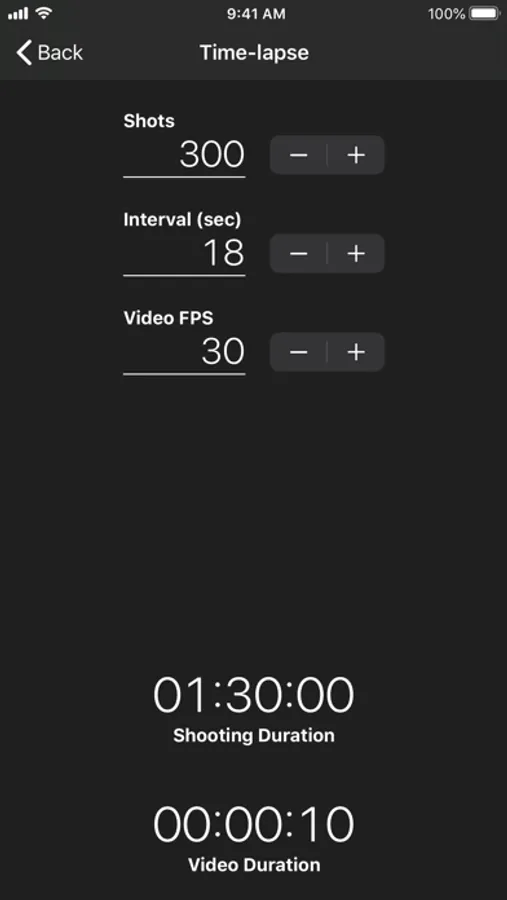 Perfect Exposure helps you plan a time-lapse shot by calculating the shooting duration and the final video duration.