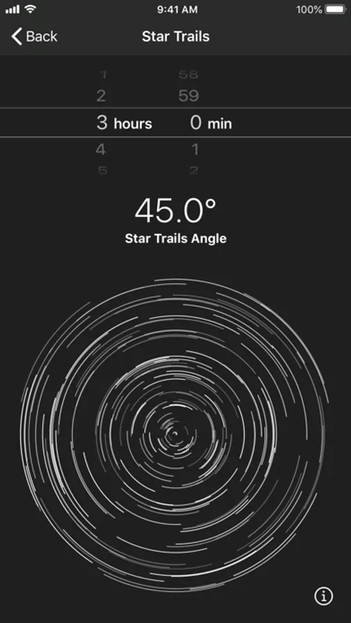 Perfect Exposure calculates the angular length of the star trails within a certain period. It also shows an illustration of the actual scene.*