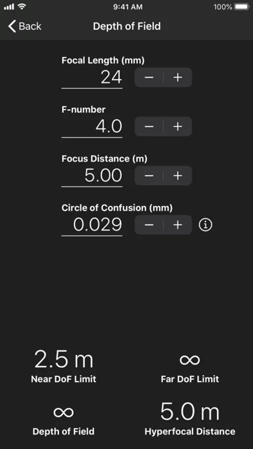 Perfect Exposure calculates the depth of field under certain focal length and aperture, as well as the hyperfocal distance.