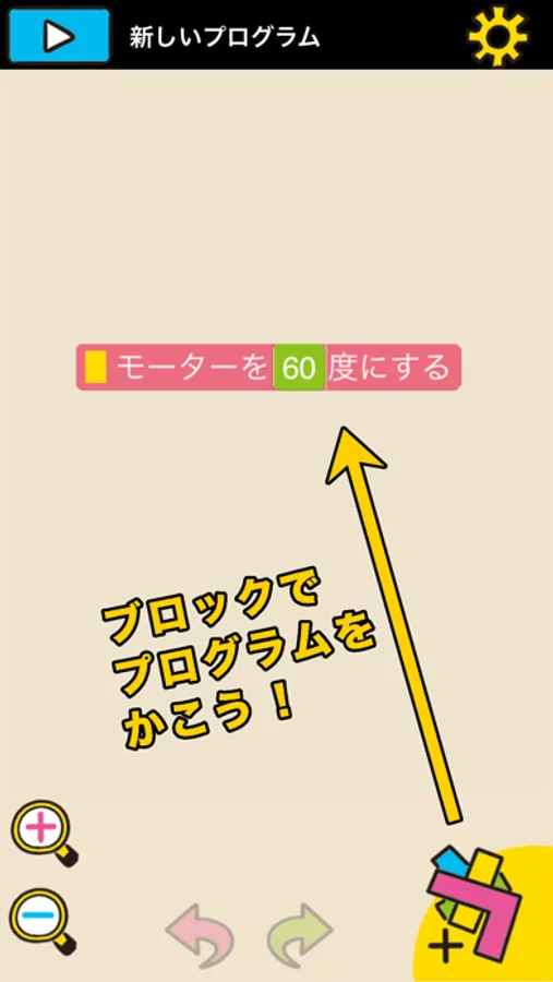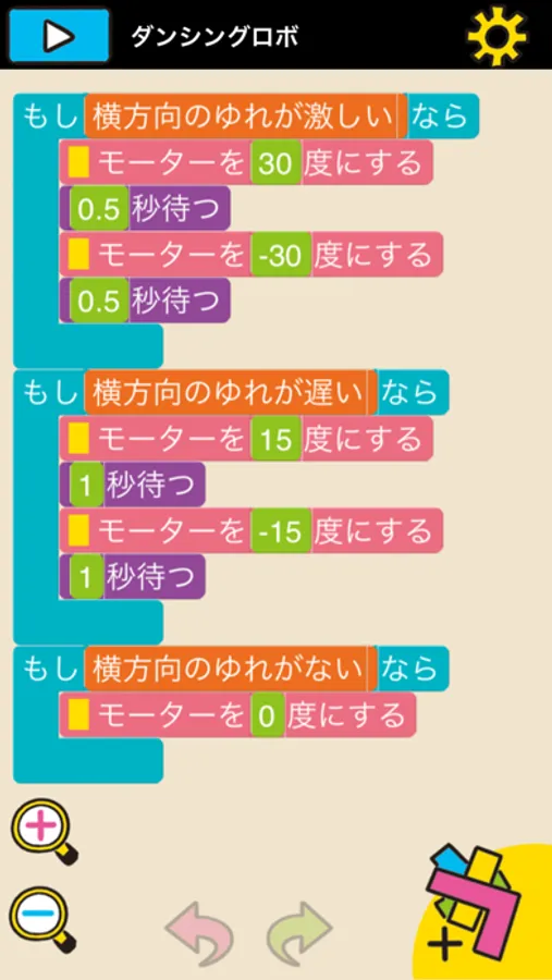 プログラミングは、用意されたブロックを組み合わせるだけ。だれでも簡単に、iPhoneに搭載されたセンサーを使ったプログラミングを体験することができます。(サーボモータを接続しなくても、画面上のプレビュー画面で、プログラミング結果のサーボモーターの動作が確認できます。)