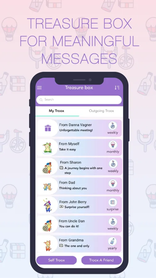 Troox bridges the gap. Troox is a treasure box of feelings, insights, memories and other meaningful messages shared between you and yourself, and the people that matter most. Instead of scrolling through endless messages, Troox dedicates itself to saving only your gems. Best of all, Troox reminds you of the messages that matter most, so they’re anchored to your life.