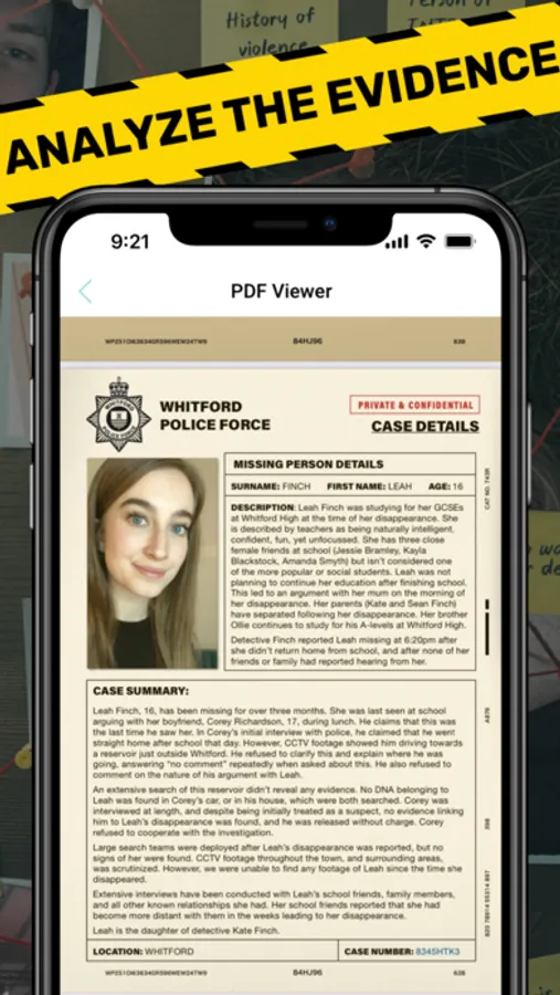 Your first case is a gripping crime mystery guaranteed to have you 'guessing whodunnit' from day 1. Amy goes missing and over 7 days you will don your detective hat and uncover the terrifying truth through her messages, photos, videos, and voice notes.