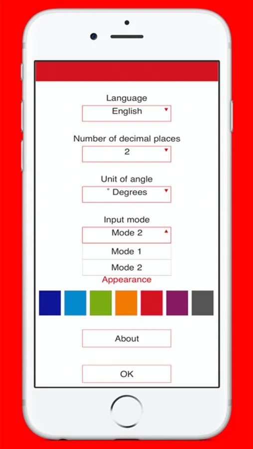 • Mode 2 (more visualized mode) - input fields for sides and angles are located directly on the triangle picture so you can easily understand which parameter you are entering.
