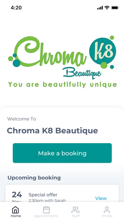The Chroma K8 Beautique app makes booking your appointments and managing your loyalty points even easier. You're just a few taps away from feeling good and looking great!