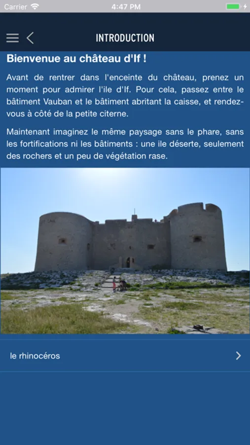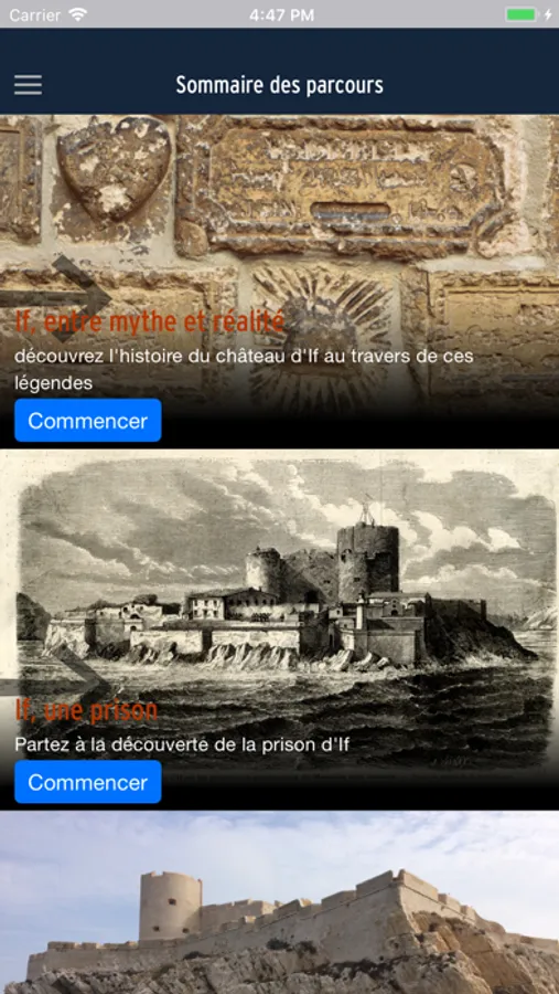 Pour une meilleure expérience de visite, cette application vous permettra d’explorer le château d’If à l’aide de deux parcours de visite inédits. Vous pourrez choisir de partir à sa découverte au travers de son histoire ou en déchiffrant ses nombreux graffitis de prisonniers. Revenez au XVIème siècle, époque à laquelle le roi François Ier décide de faire édifier cette forteresse pour défendre la ville des invasions étrangères par voie de mer.